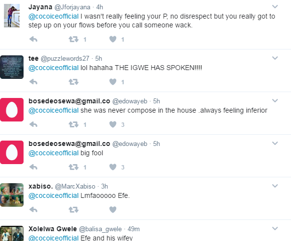 So, ex-housemate, rapper Cocoice earlier today made a tweet about wack rappers, and Efe fans one way or the other felt the tweet was directed at him and they came for her.