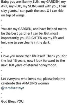 Renown motivational speaker, Fela Durotoye and his pretty wife, Tara Durotoye, of House of Tara, are celebrating their 16th wedding anniversary today May 12. Happy anniversary to them!