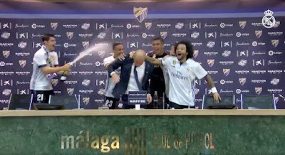 Real Madrid beat Malaga 2-0 on Sunday to secure their first league title for five years. And clearly in a good mood, a select few of Madrid's players decided to surprise their boss Zinedine Zidane by invading his post-match press conference and drenching him in champagne.
