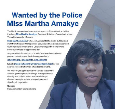 The Police has arrested the Stanbic Bank worker, Martha Amakye, who allegedly defrauded the bank’s customers to the tune of GHc900,000 (over N65million)..She was arrested at Ashaiman in the Greater Accra region based on a tip-off.