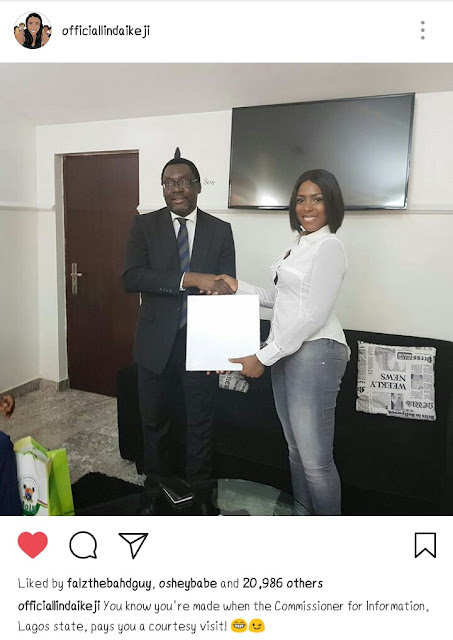 Linda revealed her excitement and shared a picture with the caption: "You know you're made when the Commissioner for Information, Lagos state, pays you a courtesy visit!"